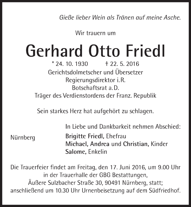 Hier finden Sie alle Traueranzeigen aus der Zeitung, die bisher für Gerhard Otto Friedl erschienen sind. Weitere Traueranzeigen, die in der Zeitung erscheinen, werden hier ebenfalls aufgelistet