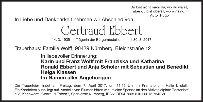 Hier finden Sie alle Traueranzeigen aus der Zeitung, die bisher für Gertraud Ebbert erschienen sind. Weitere Traueranzeigen, die in der Zeitung erscheinen, werden hier ebenfalls aufgelistet