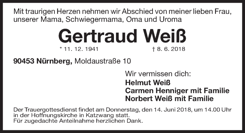 Hier finden Sie alle Traueranzeigen aus der Zeitung, die bisher für Gertraud Weiß erschienen sind. Weitere Traueranzeigen, die in der Zeitung erscheinen, werden hier ebenfalls aufgelistet