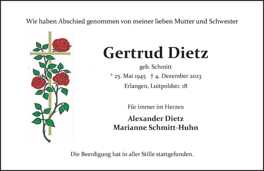Hier finden Sie alle Traueranzeigen aus der Zeitung, die bisher für Gertrud Dietz erschienen sind. Weitere Traueranzeigen, die in der Zeitung erscheinen, werden hier ebenfalls aufgelistet