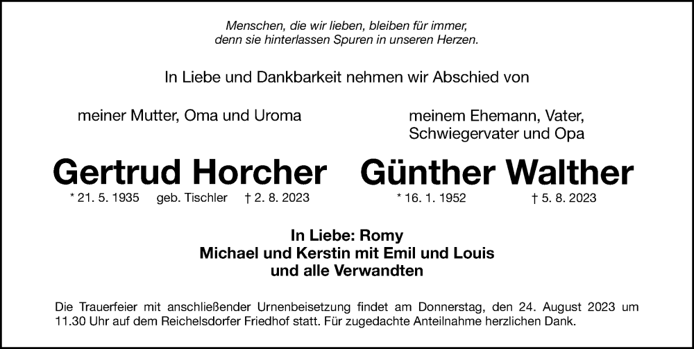 Hier finden Sie alle Traueranzeigen aus der Zeitung, die bisher für Gertrud Horcher erschienen sind. Weitere Traueranzeigen, die in der Zeitung erscheinen, werden hier ebenfalls aufgelistet