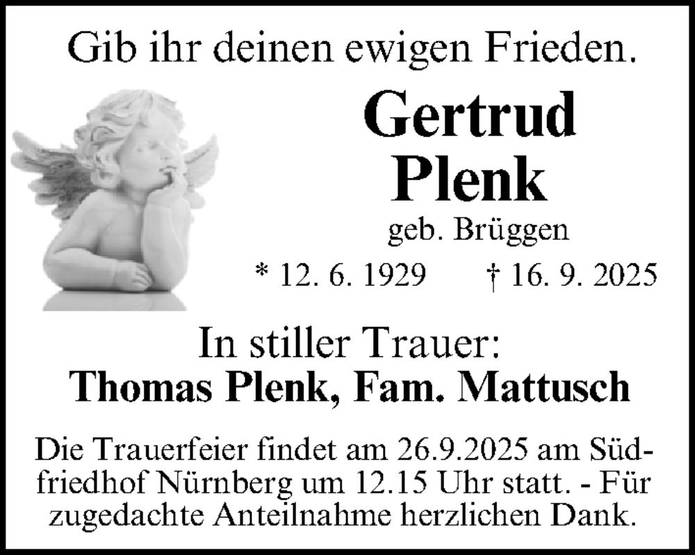 Hier finden Sie alle Traueranzeigen aus der Zeitung, die bisher für Gertrud Plenk erschienen sind. Weitere Traueranzeigen, die in der Zeitung erscheinen, werden hier ebenfalls aufgelistet