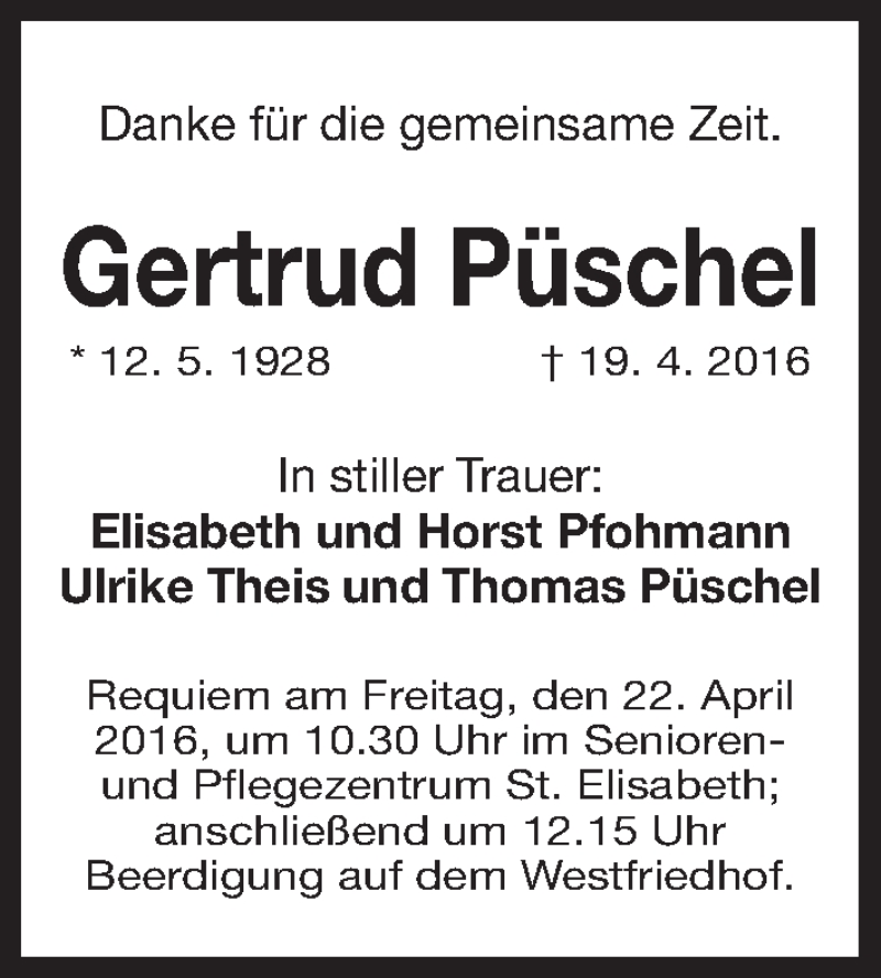 Hier finden Sie alle Traueranzeigen aus der Zeitung, die bisher für Gertrud Püschel erschienen sind. Weitere Traueranzeigen, die in der Zeitung erscheinen, werden hier ebenfalls aufgelistet