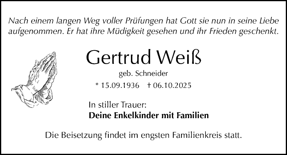 Hier finden Sie alle Traueranzeigen aus der Zeitung, die bisher für Gertrud Weiß erschienen sind. Weitere Traueranzeigen, die in der Zeitung erscheinen, werden hier ebenfalls aufgelistet