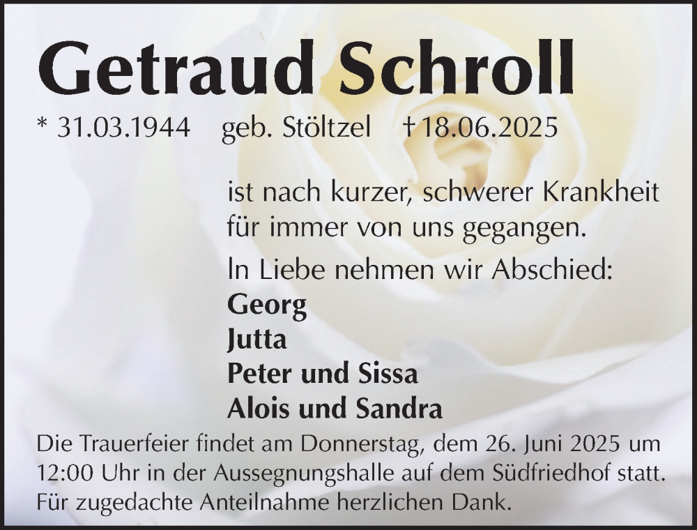 Hier finden Sie alle Traueranzeigen aus der Zeitung, die bisher für Getraud Schroll erschienen sind. Weitere Traueranzeigen, die in der Zeitung erscheinen, werden hier ebenfalls aufgelistet