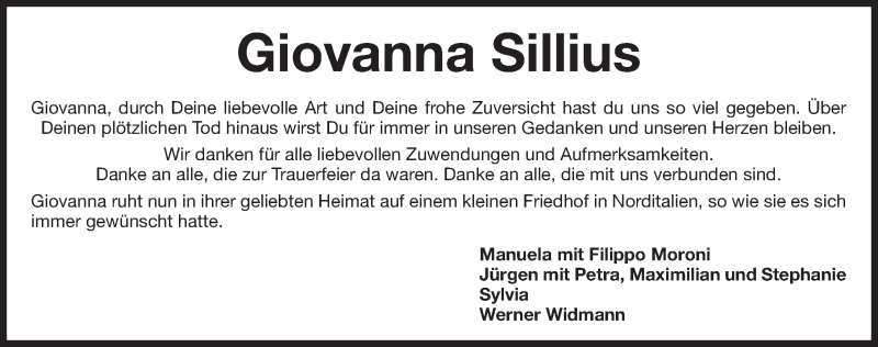 Hier finden Sie alle Traueranzeigen aus der Zeitung, die bisher für Giovanna Sillius erschienen sind. Weitere Traueranzeigen, die in der Zeitung erscheinen, werden hier ebenfalls aufgelistet
