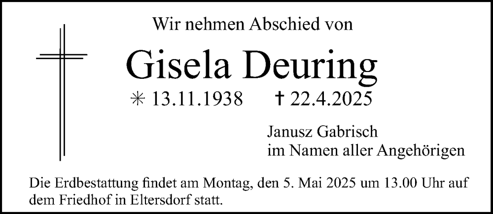 Hier finden Sie alle Traueranzeigen aus der Zeitung, die bisher für Gisela Deuring erschienen sind. Weitere Traueranzeigen, die in der Zeitung erscheinen, werden hier ebenfalls aufgelistet