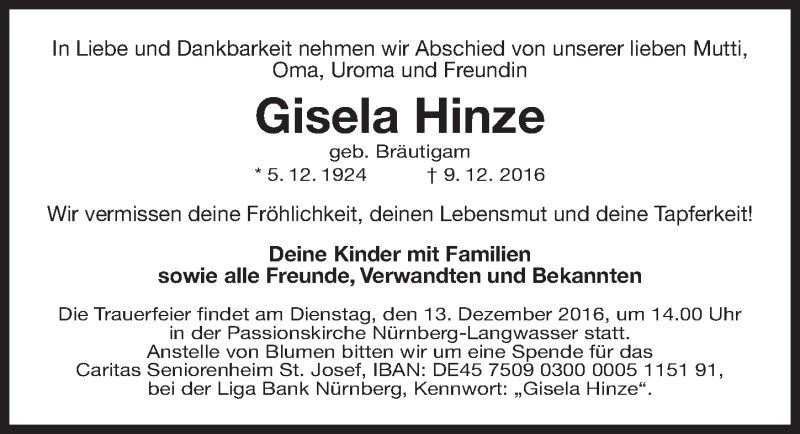 Hier finden Sie alle Traueranzeigen aus der Zeitung, die bisher für Gisela Hinze erschienen sind. Weitere Traueranzeigen, die in der Zeitung erscheinen, werden hier ebenfalls aufgelistet