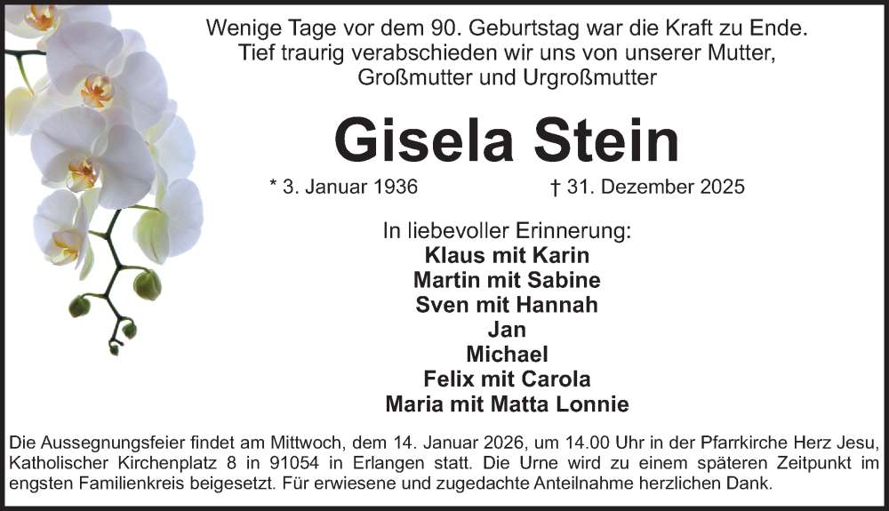 Hier finden Sie alle Traueranzeigen aus der Zeitung, die bisher für Gisela Stein erschienen sind. Weitere Traueranzeigen, die in der Zeitung erscheinen, werden hier ebenfalls aufgelistet