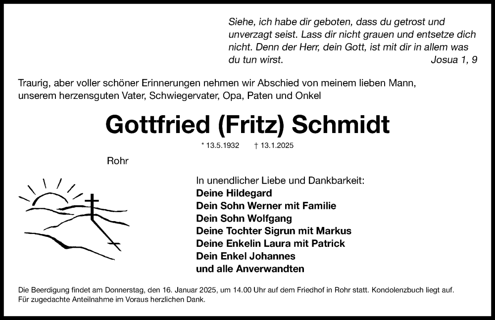 Hier finden Sie alle Traueranzeigen aus der Zeitung, die bisher für Gottfried Schmidt erschienen sind. Weitere Traueranzeigen, die in der Zeitung erscheinen, werden hier ebenfalls aufgelistet
