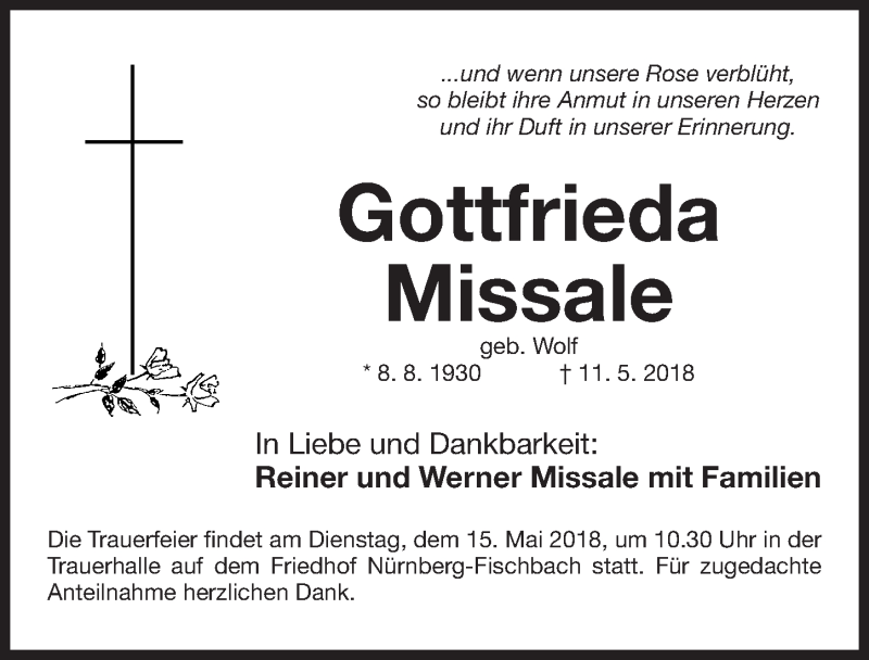 Hier finden Sie alle Traueranzeigen aus der Zeitung, die bisher für Gottfrieda Missale erschienen sind. Weitere Traueranzeigen, die in der Zeitung erscheinen, werden hier ebenfalls aufgelistet