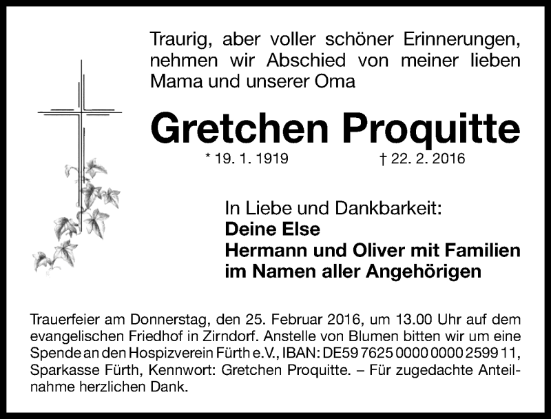 Hier finden Sie alle Traueranzeigen aus der Zeitung, die bisher für Gretchen Proquitte erschienen sind. Weitere Traueranzeigen, die in der Zeitung erscheinen, werden hier ebenfalls aufgelistet