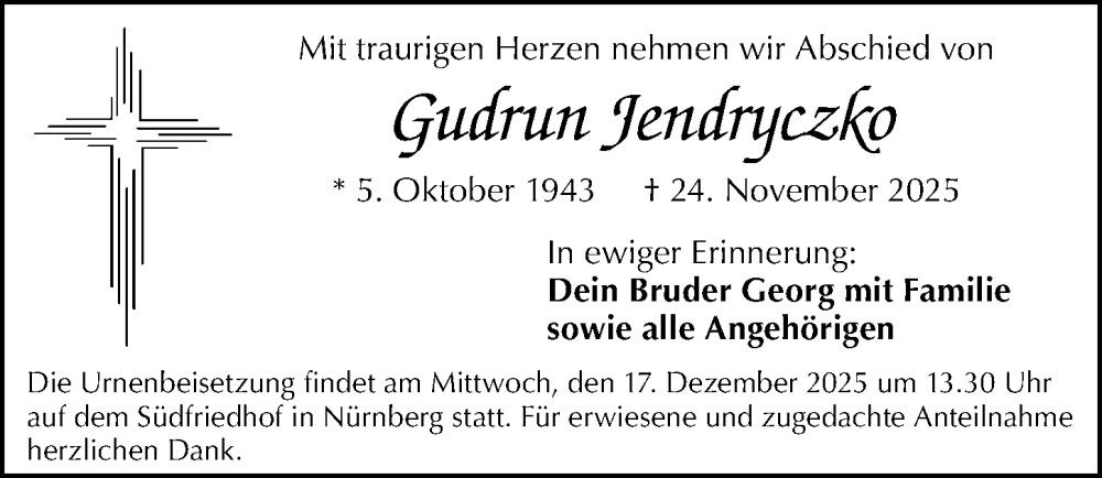 Hier finden Sie alle Traueranzeigen aus der Zeitung, die bisher für Gudrun Jendryczko erschienen sind. Weitere Traueranzeigen, die in der Zeitung erscheinen, werden hier ebenfalls aufgelistet