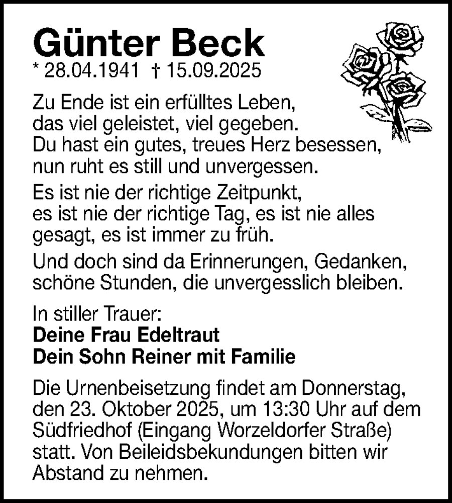 Hier finden Sie alle Traueranzeigen aus der Zeitung, die bisher für Günter Beck erschienen sind. Weitere Traueranzeigen, die in der Zeitung erscheinen, werden hier ebenfalls aufgelistet