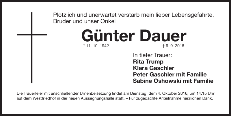 Hier finden Sie alle Traueranzeigen aus der Zeitung, die bisher für Günter Dauer erschienen sind. Weitere Traueranzeigen, die in der Zeitung erscheinen, werden hier ebenfalls aufgelistet