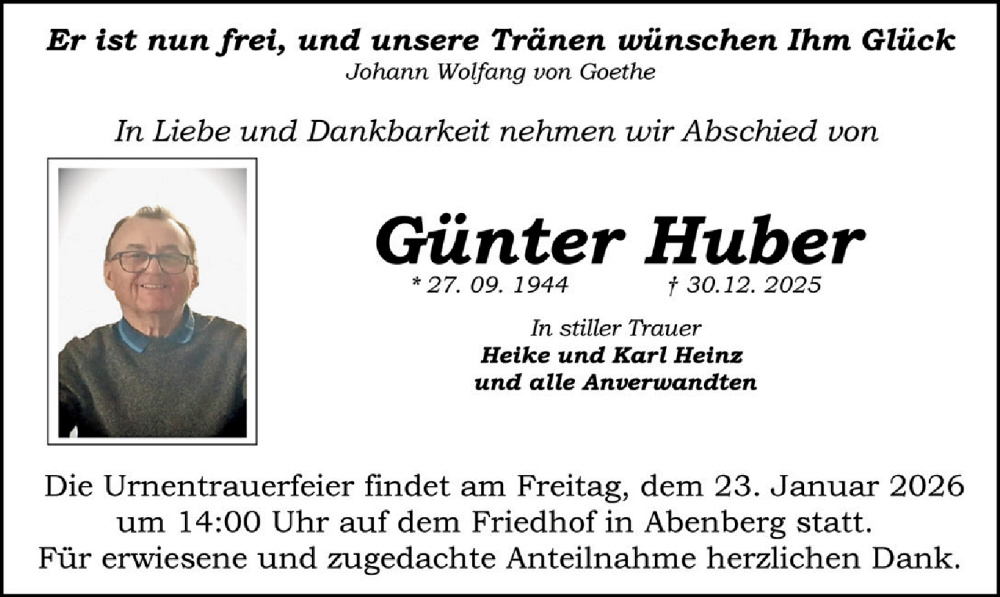 Hier finden Sie alle Traueranzeigen aus der Zeitung, die bisher für Günter Huber erschienen sind. Weitere Traueranzeigen, die in der Zeitung erscheinen, werden hier ebenfalls aufgelistet