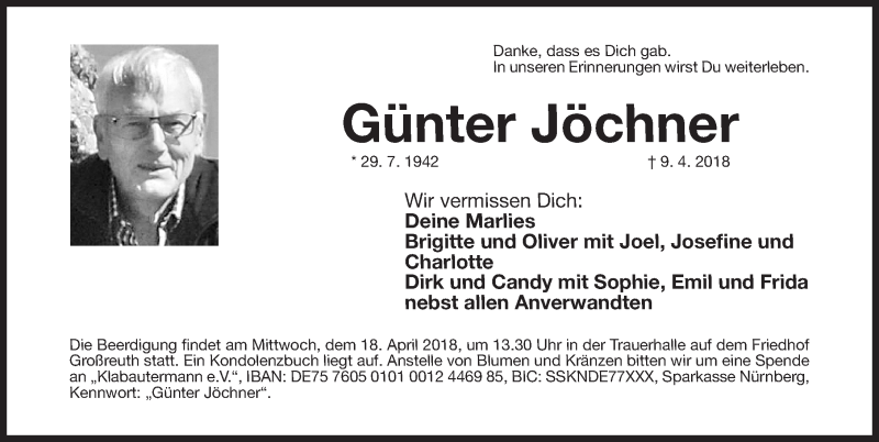 Hier finden Sie alle Traueranzeigen aus der Zeitung, die bisher für Günter Jöchner erschienen sind. Weitere Traueranzeigen, die in der Zeitung erscheinen, werden hier ebenfalls aufgelistet