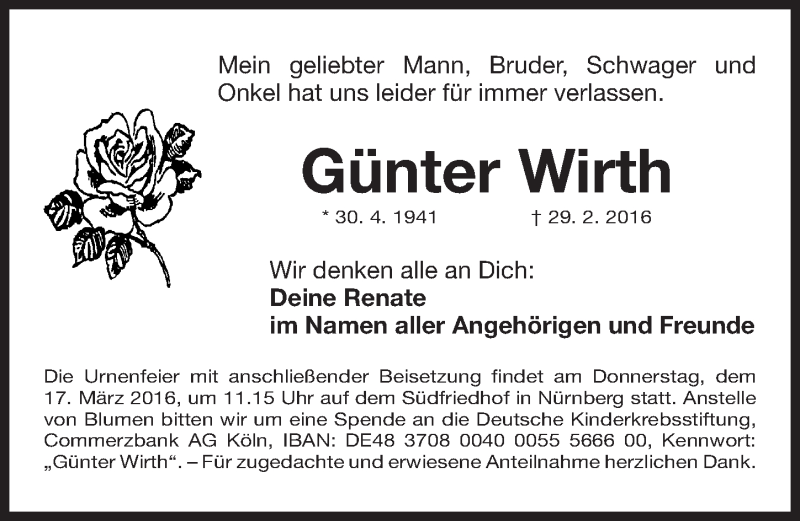 Hier finden Sie alle Traueranzeigen aus der Zeitung, die bisher für Günter Wirth erschienen sind. Weitere Traueranzeigen, die in der Zeitung erscheinen, werden hier ebenfalls aufgelistet