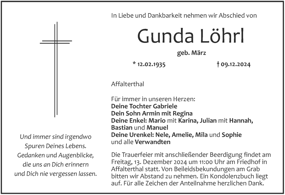 Hier finden Sie alle Traueranzeigen aus der Zeitung, die bisher für Gunda Löhrl erschienen sind. Weitere Traueranzeigen, die in der Zeitung erscheinen, werden hier ebenfalls aufgelistet