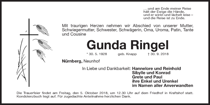 Hier finden Sie alle Traueranzeigen aus der Zeitung, die bisher für Gunda Ringel erschienen sind. Weitere Traueranzeigen, die in der Zeitung erscheinen, werden hier ebenfalls aufgelistet