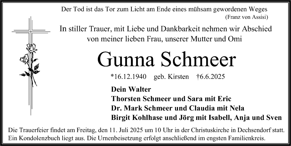 Hier finden Sie alle Traueranzeigen aus der Zeitung, die bisher für Gunna Schmeer erschienen sind. Weitere Traueranzeigen, die in der Zeitung erscheinen, werden hier ebenfalls aufgelistet