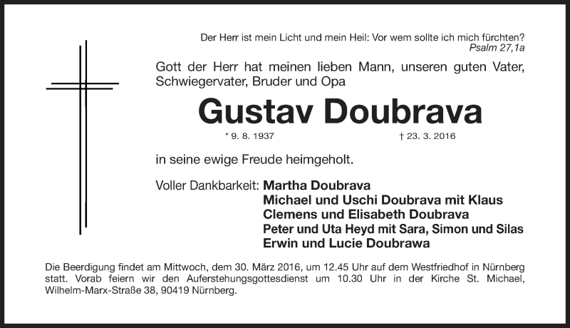Hier finden Sie alle Traueranzeigen aus der Zeitung, die bisher für Gustav Doubrava erschienen sind. Weitere Traueranzeigen, die in der Zeitung erscheinen, werden hier ebenfalls aufgelistet