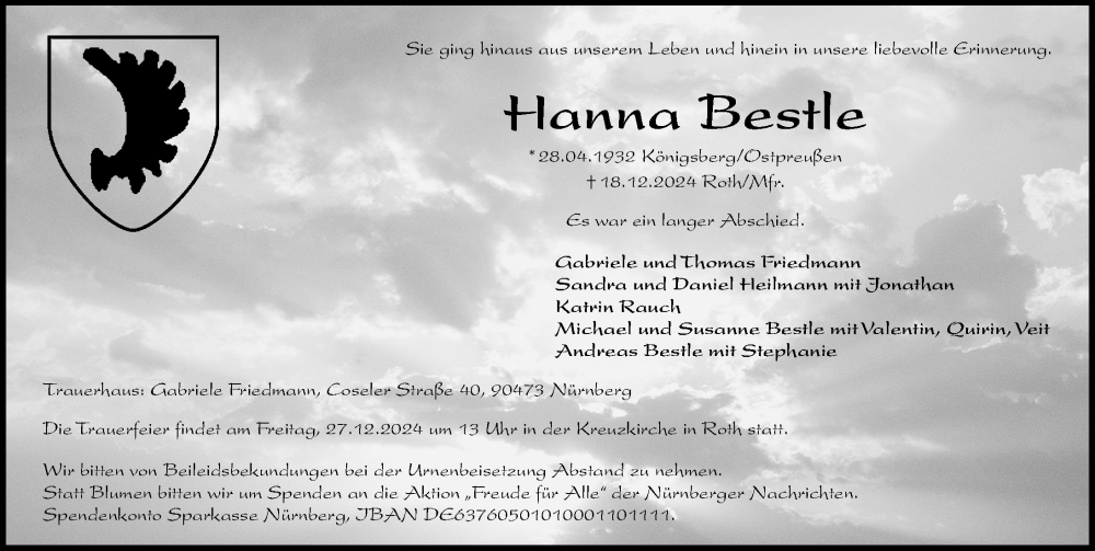 Hier finden Sie alle Traueranzeigen aus der Zeitung, die bisher für Hanna Bestle erschienen sind. Weitere Traueranzeigen, die in der Zeitung erscheinen, werden hier ebenfalls aufgelistet