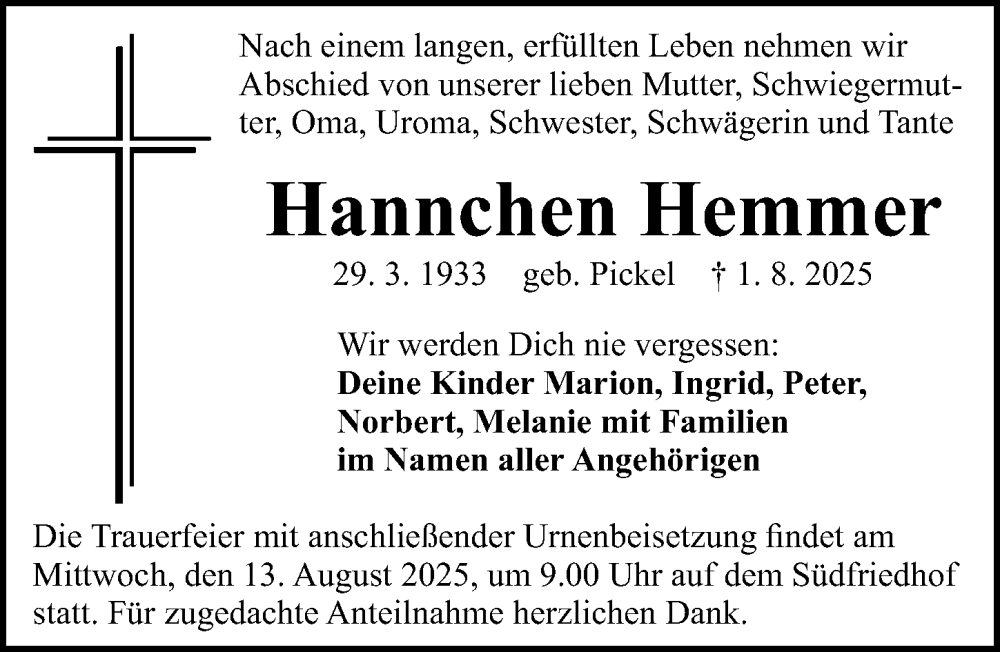 Hier finden Sie alle Traueranzeigen aus der Zeitung, die bisher für Hannchen Hemmer erschienen sind. Weitere Traueranzeigen, die in der Zeitung erscheinen, werden hier ebenfalls aufgelistet
