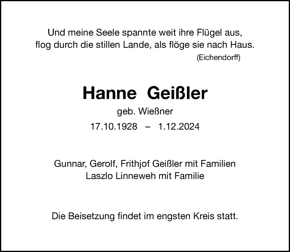 Hier finden Sie alle Traueranzeigen aus der Zeitung, die bisher für Hanne Geißler erschienen sind. Weitere Traueranzeigen, die in der Zeitung erscheinen, werden hier ebenfalls aufgelistet