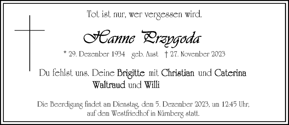 Hier finden Sie alle Traueranzeigen aus der Zeitung, die bisher für Hanne Przypgoda erschienen sind. Weitere Traueranzeigen, die in der Zeitung erscheinen, werden hier ebenfalls aufgelistet