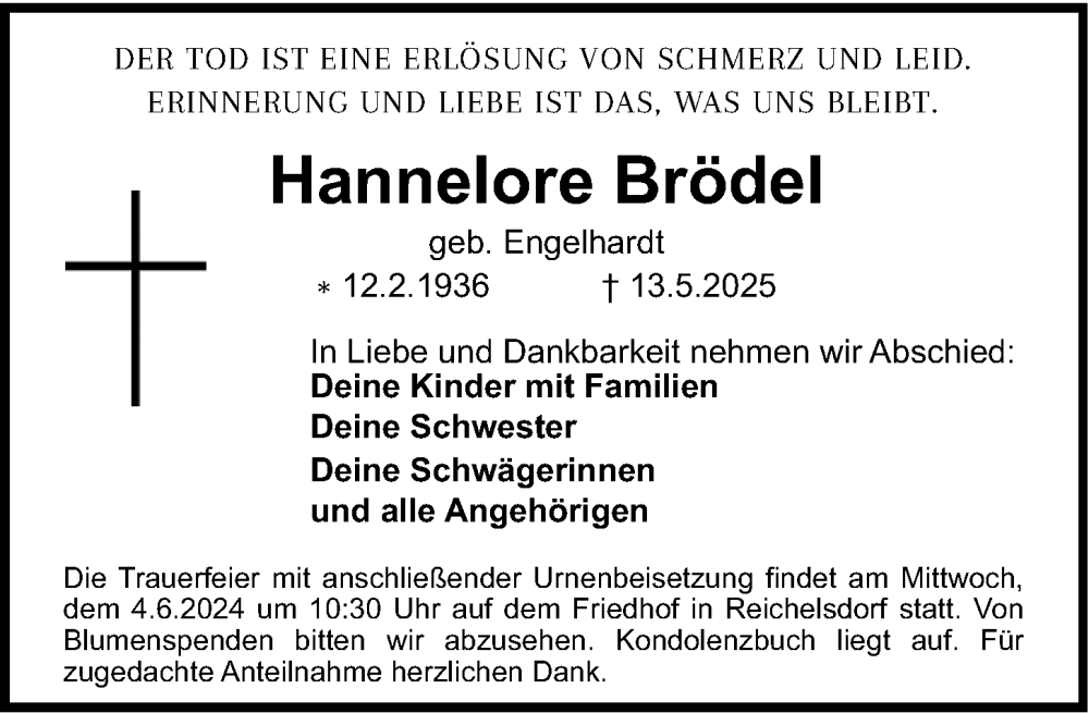 Hier finden Sie alle Traueranzeigen aus der Zeitung, die bisher für Hannelore Brödel erschienen sind. Weitere Traueranzeigen, die in der Zeitung erscheinen, werden hier ebenfalls aufgelistet