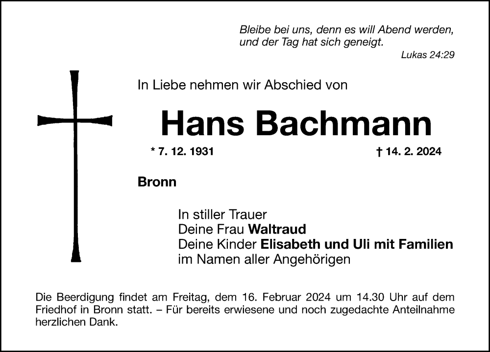 Hier finden Sie alle Traueranzeigen aus der Zeitung, die bisher für Hans Bachmann erschienen sind. Weitere Traueranzeigen, die in der Zeitung erscheinen, werden hier ebenfalls aufgelistet