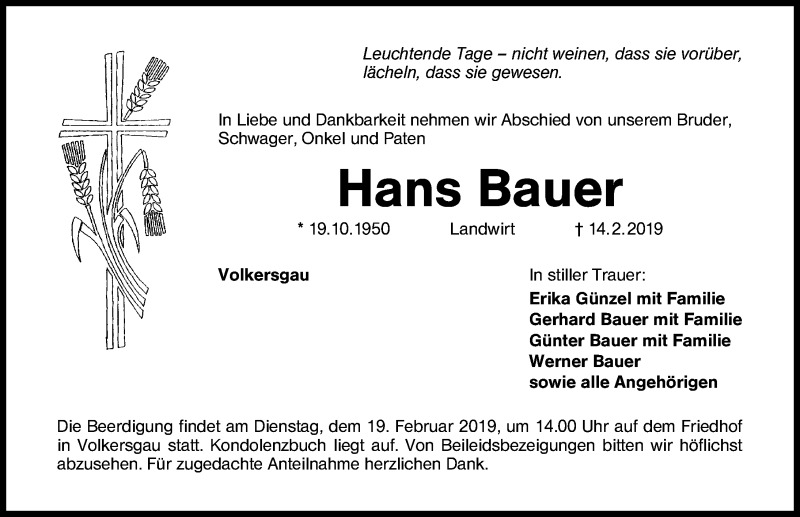 Hier finden Sie alle Traueranzeigen aus der Zeitung, die bisher für Hans Bauer erschienen sind. Weitere Traueranzeigen, die in der Zeitung erscheinen, werden hier ebenfalls aufgelistet