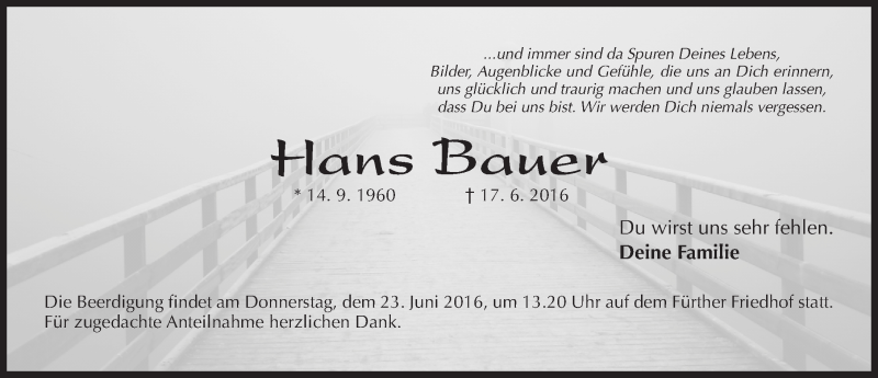 Hier finden Sie alle Traueranzeigen aus der Zeitung, die bisher für Hans Bauer erschienen sind. Weitere Traueranzeigen, die in der Zeitung erscheinen, werden hier ebenfalls aufgelistet