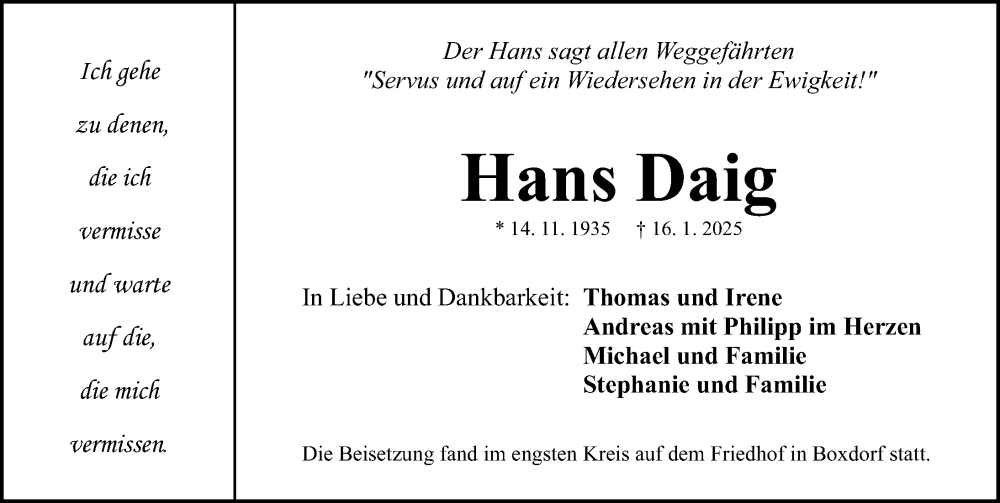 Hier finden Sie alle Traueranzeigen aus der Zeitung, die bisher für Hans Daig erschienen sind. Weitere Traueranzeigen, die in der Zeitung erscheinen, werden hier ebenfalls aufgelistet