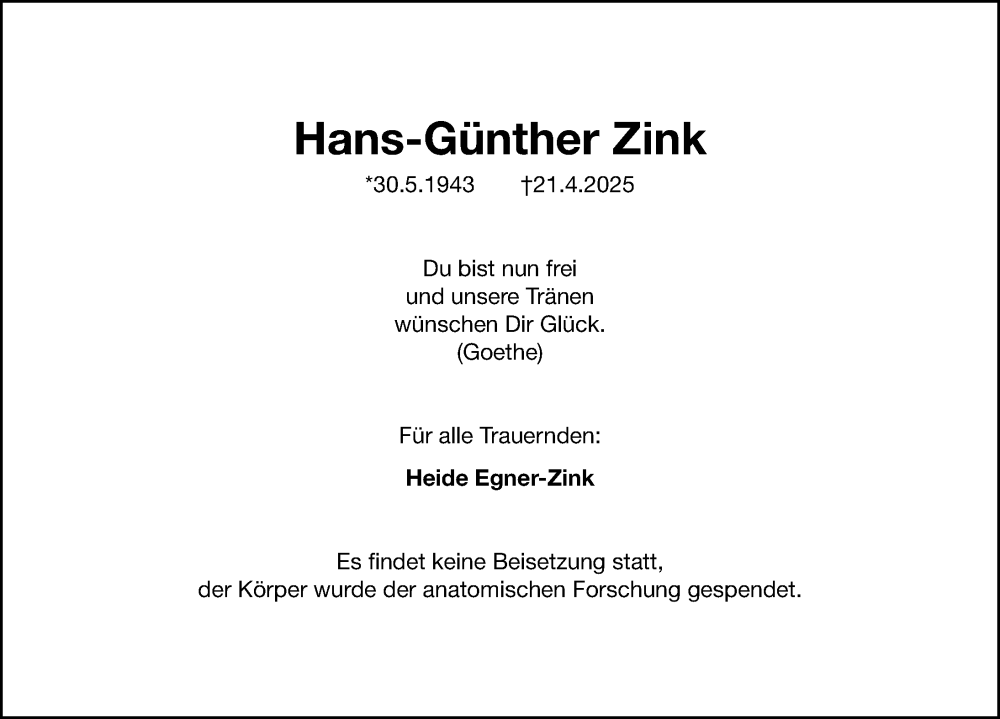 Hier finden Sie alle Traueranzeigen aus der Zeitung, die bisher für Hans-Günther Zink erschienen sind. Weitere Traueranzeigen, die in der Zeitung erscheinen, werden hier ebenfalls aufgelistet