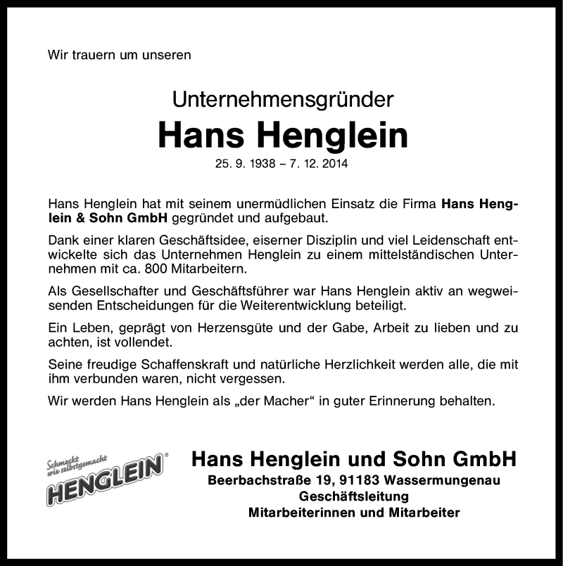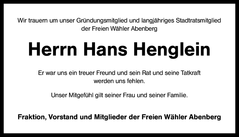 Hier finden Sie alle Traueranzeigen aus der Zeitung, die bisher für Hans Henglein erschienen sind. Weitere Traueranzeigen, die in der Zeitung erscheinen, werden hier ebenfalls aufgelistet