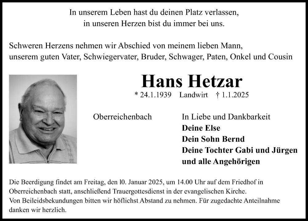 Hier finden Sie alle Traueranzeigen aus der Zeitung, die bisher für Hans Hetzar erschienen sind. Weitere Traueranzeigen, die in der Zeitung erscheinen, werden hier ebenfalls aufgelistet