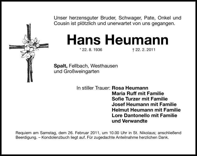 Hier finden Sie alle Traueranzeigen aus der Zeitung, die bisher für Hans Heumann erschienen sind. Weitere Traueranzeigen, die in der Zeitung erscheinen, werden hier ebenfalls aufgelistet