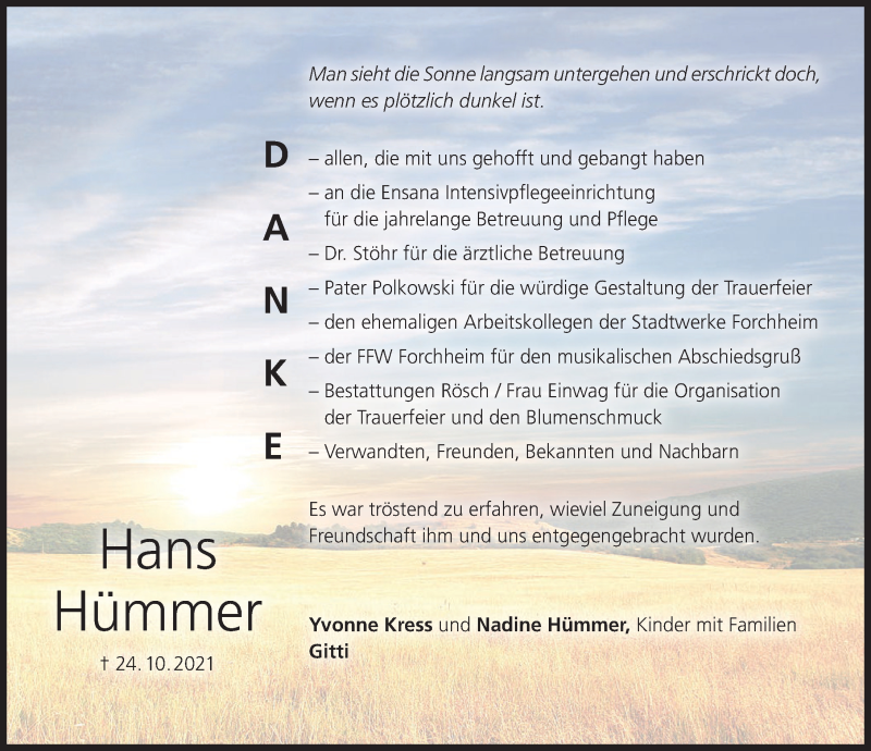 Hier finden Sie alle Traueranzeigen aus der Zeitung, die bisher für Hans Hümmer erschienen sind. Weitere Traueranzeigen, die in der Zeitung erscheinen, werden hier ebenfalls aufgelistet