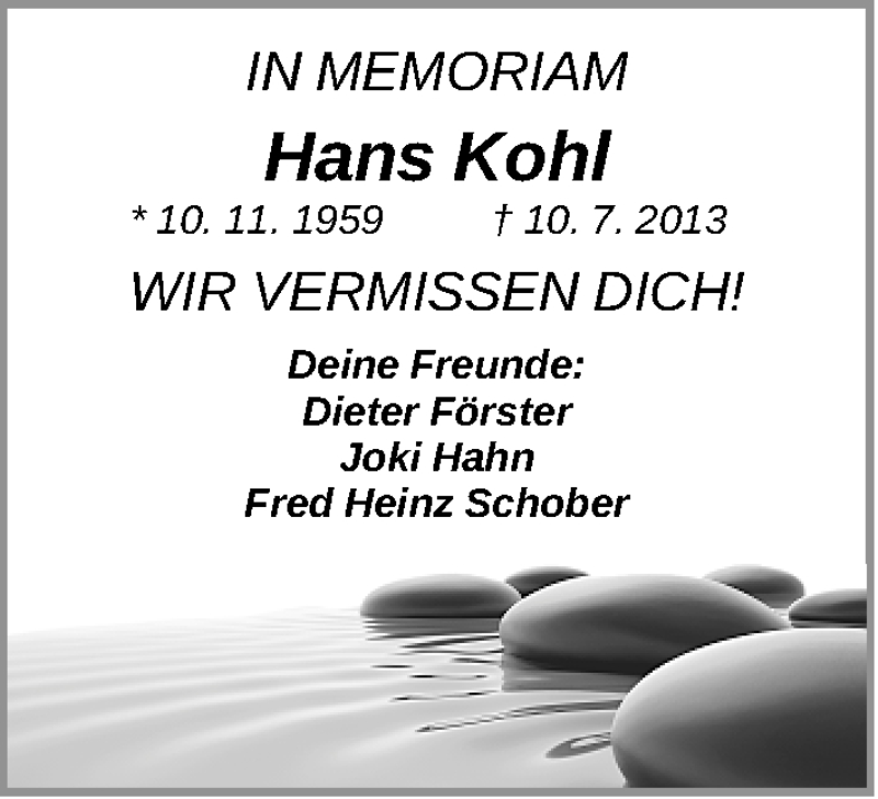Hier finden Sie alle Traueranzeigen aus der Zeitung, die bisher für Hans Kohl erschienen sind. Weitere Traueranzeigen, die in der Zeitung erscheinen, werden hier ebenfalls aufgelistet
