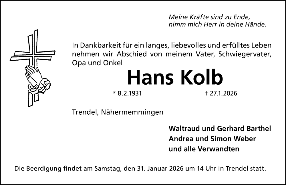 Hier finden Sie alle Traueranzeigen aus der Zeitung, die bisher für Hans Kolb erschienen sind. Weitere Traueranzeigen, die in der Zeitung erscheinen, werden hier ebenfalls aufgelistet