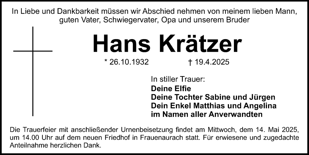 Hier finden Sie alle Traueranzeigen aus der Zeitung, die bisher für Hans Krätzer erschienen sind. Weitere Traueranzeigen, die in der Zeitung erscheinen, werden hier ebenfalls aufgelistet