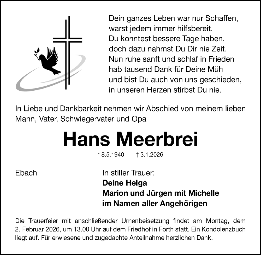 Hier finden Sie alle Traueranzeigen aus der Zeitung, die bisher für Hans Meerbrei erschienen sind. Weitere Traueranzeigen, die in der Zeitung erscheinen, werden hier ebenfalls aufgelistet
