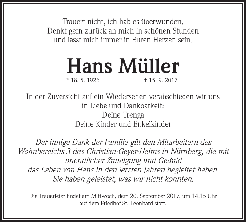 Hier finden Sie alle Traueranzeigen aus der Zeitung, die bisher für Hans Müller erschienen sind. Weitere Traueranzeigen, die in der Zeitung erscheinen, werden hier ebenfalls aufgelistet
