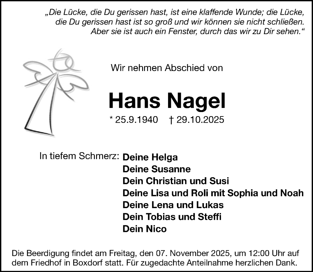 Hier finden Sie alle Traueranzeigen aus der Zeitung, die bisher für Hans Nagel erschienen sind. Weitere Traueranzeigen, die in der Zeitung erscheinen, werden hier ebenfalls aufgelistet