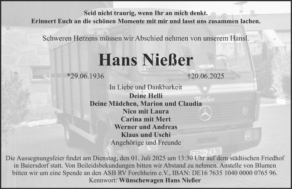 Hier finden Sie alle Traueranzeigen aus der Zeitung, die bisher für Hans Nießer erschienen sind. Weitere Traueranzeigen, die in der Zeitung erscheinen, werden hier ebenfalls aufgelistet