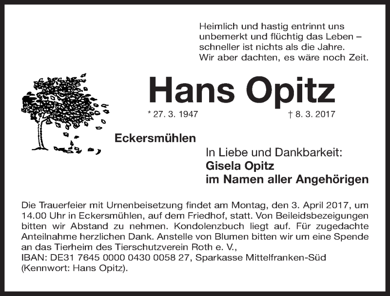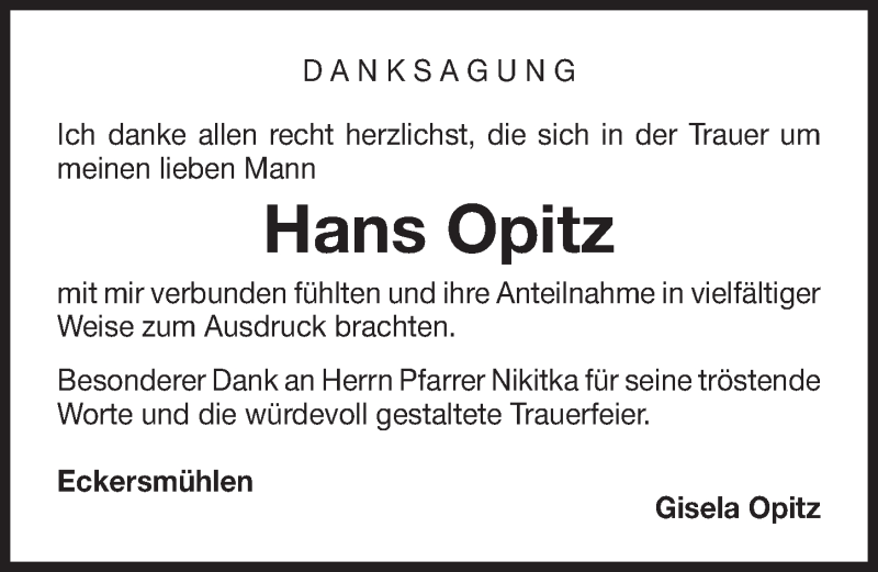 Hier finden Sie alle Traueranzeigen aus der Zeitung, die bisher für Hans Opitz erschienen sind. Weitere Traueranzeigen, die in der Zeitung erscheinen, werden hier ebenfalls aufgelistet