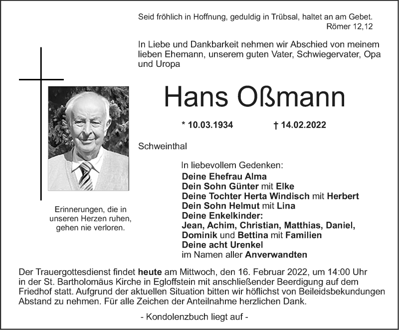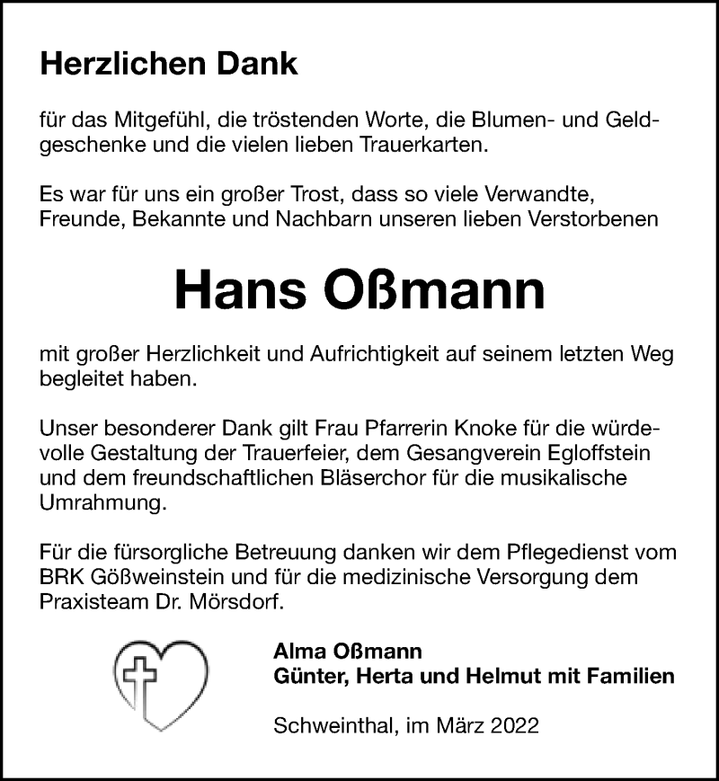 Hier finden Sie alle Traueranzeigen aus der Zeitung, die bisher für Hans Oßmann erschienen sind. Weitere Traueranzeigen, die in der Zeitung erscheinen, werden hier ebenfalls aufgelistet