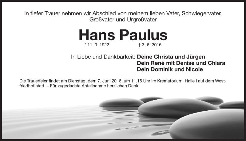 Hier finden Sie alle Traueranzeigen aus der Zeitung, die bisher für Hans Paulus erschienen sind. Weitere Traueranzeigen, die in der Zeitung erscheinen, werden hier ebenfalls aufgelistet